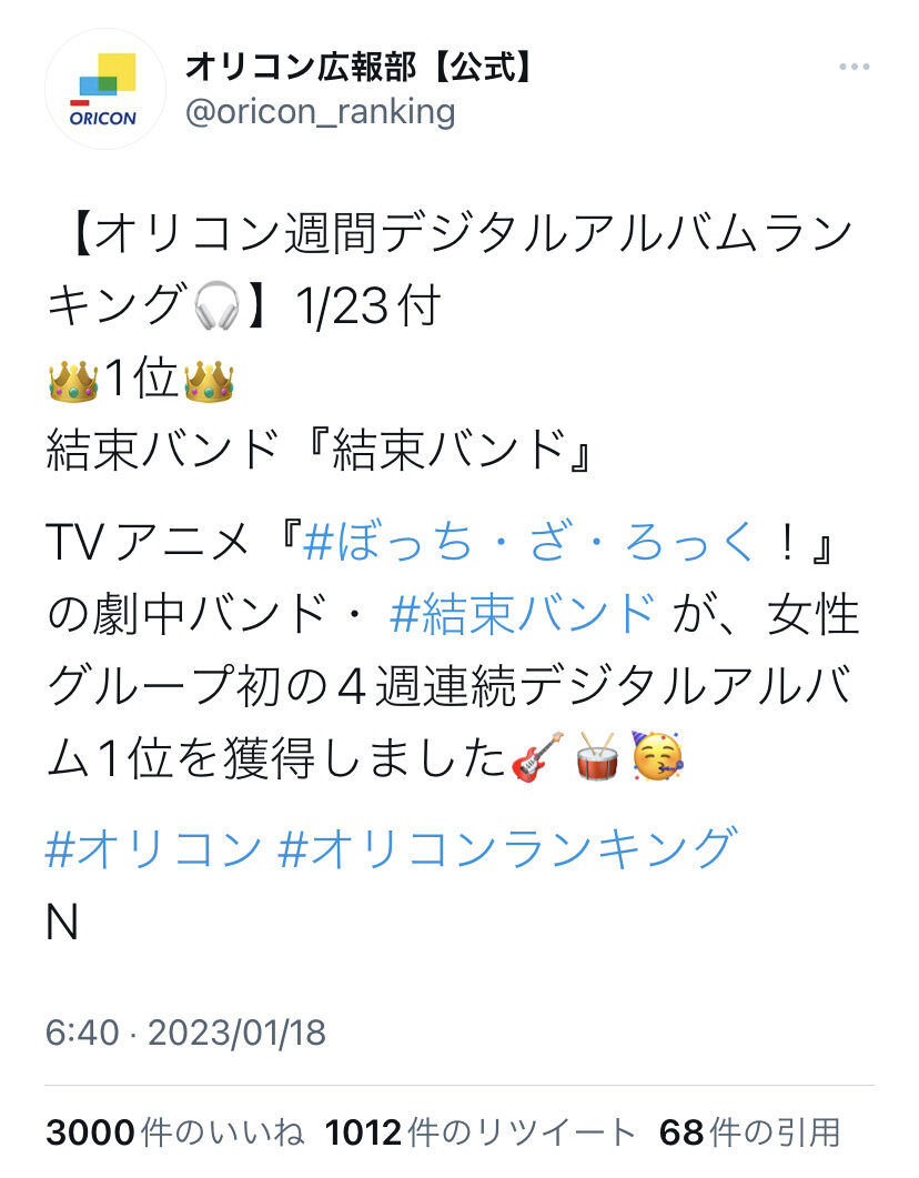 【朗報】『ぼっち・ざ・ろっく!』アルバム「結束バンド」アイドルに勝利☆4週連続オリコン1位獲得!