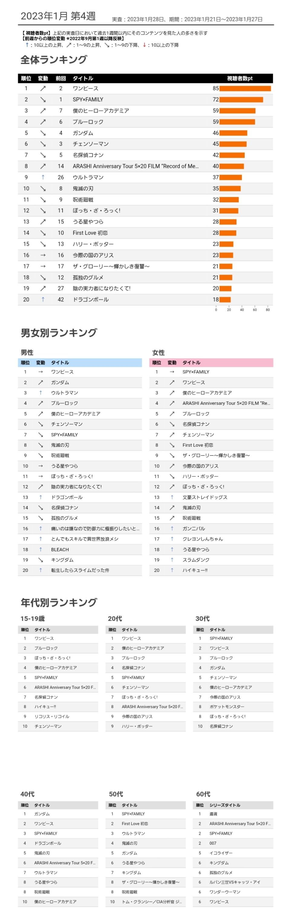 男女別も全体もほぼ同じ順位なのが特徴的で10代>20代>30代なのは相変わらず高校生に大人気