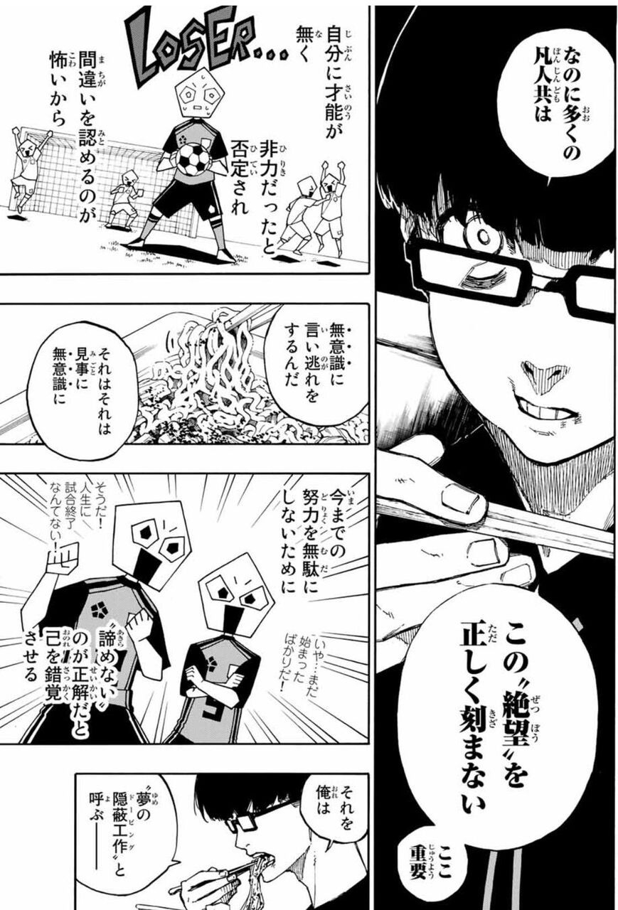 このカイザーの消極的な姿勢、もしかして馬狼の時の「絶望する才能」の話がまた出てくるんじゃないか。カイザーは実は絶望から目を背けてて、無意識に逃避行動を選んだ結果が他にチームに行く という事なのか。馬狼と潔にそれを気付かされる。とか