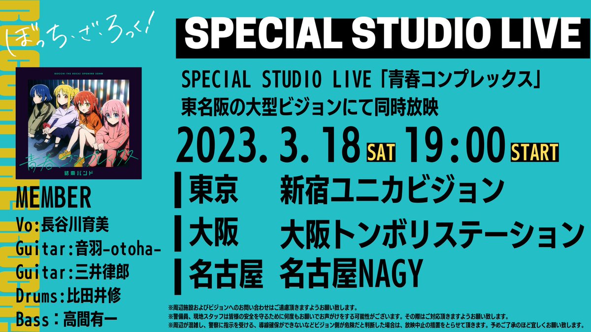 【重要】『ぼっち・ざ・ろっく!』Vo長谷川育美「青春コンプレックス」SpecialStudioLive!東名阪大型ビジョンにて同時放映決定!!!!!!