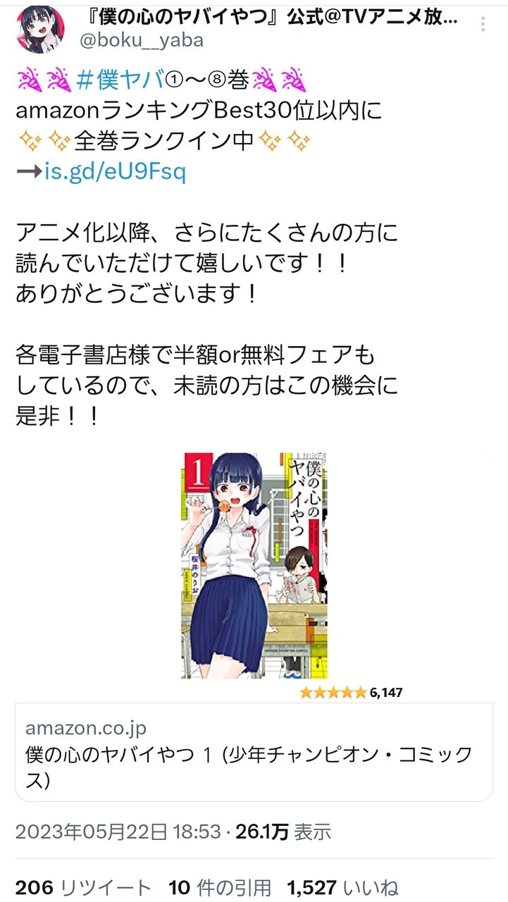 【祝報】『僕の心のヤバイやつ』漫画1~8巻全てがAmazonで30位以内にランクイン!!☆☆☆☆☆☆☆